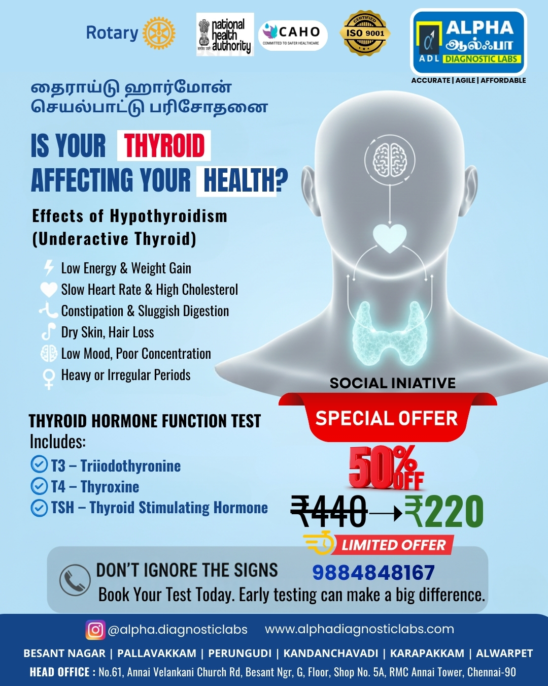 Check your thyroid health with Alpha ADL Diagnostic Labs. Get a complete Thyroid Hormone Function Test (T3, T4 & TSH) at just ₹220. Accurate, fast, and affordable testing available across Chennai.