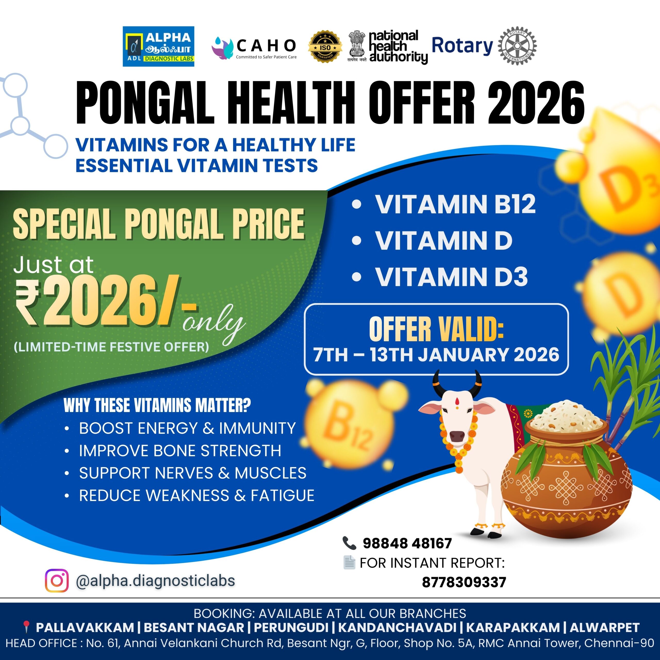 Get tested for essential vitamins at a special festive price. This package includes Vitamin B12, Vitamin D & Vitamin D3 to help boost energy, improve immunity, strengthen bones, and reduce weakness. Available for a limited time only at Alpha Diagnostic Labs