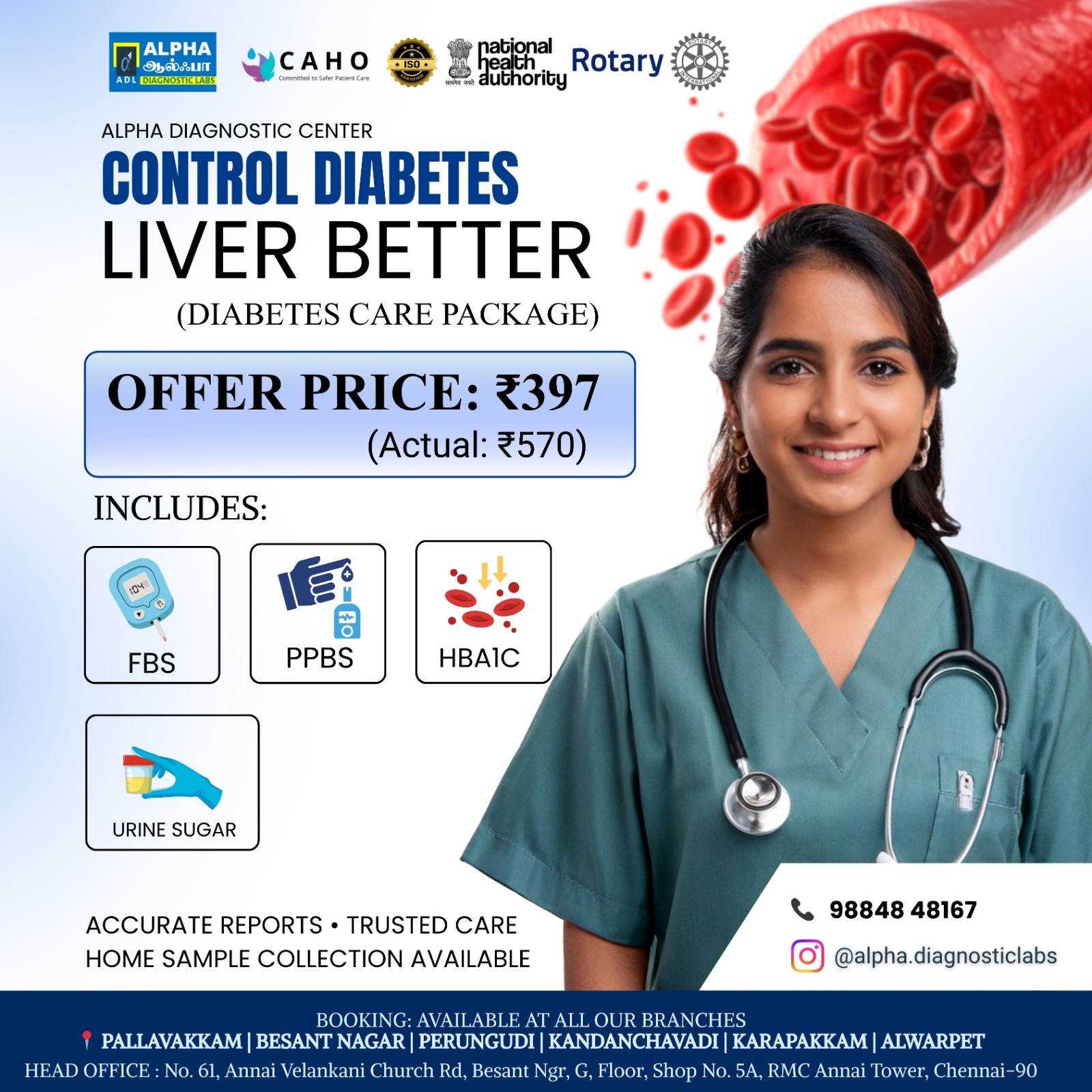 A complete diabetes screening package to help monitor blood sugar levels and prevent complications early. Includes Fasting Blood Sugar (FBS), Post Prandial Blood Sugar (PPBS), HbA1c, and Urine Sugar tests to support better diabetes control and overall health.